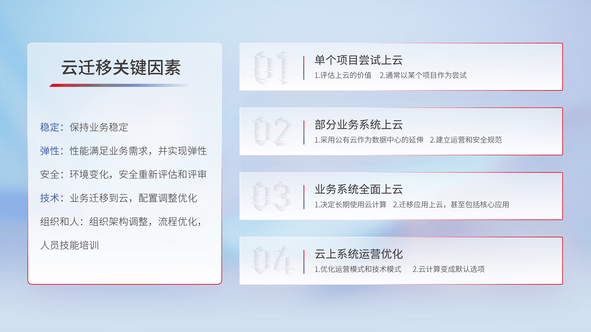 结合实际业务,,,,从规划设计、、、云平台选型、、、、云原生改造、、、数据迁移、、、集成交付,,,,迁移全过程为客户识别最佳上云路径,,,做好风险识别管理,,,设计网络架构、、身份权限、、安全审计合规、、、操作审计、、日志审计、、、、监控告警策略、、、、多站点容灾设计等,,对云上基础设施进行整体规划,,,提升IT治理水平,,以满足弹性、、、、高可用、、高性能的需求。。。