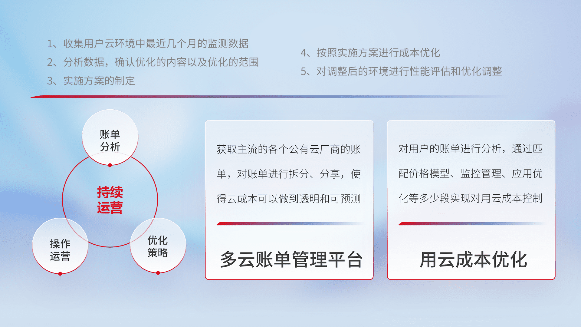 通过多云纳管,,,,以统一的资源数据模型把客户的云资源进行抽象和封装,,进而实现对多云资源的统一操作,,,,保障云资源管理的可靠性、、、、稳定性与可用性。。。量身定制化运维内容,,,,配置、、、、开发运维、、、补丁管理、、、备份、、、监控、、、认证和访问管理、、、审计和日常巡检等,,,保障在用云过程中的可靠度,,,,稳定度以及高可用率。。。。